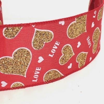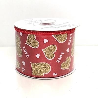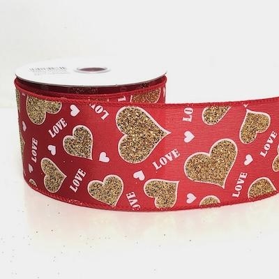 Gold Hearts Love Ribbon 63mm with wired edge ideal for Valentines Day.