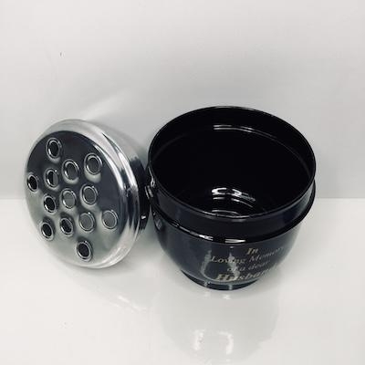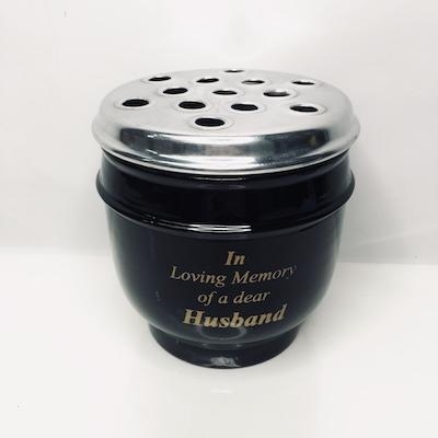 Metal In Loving Memory Memorial Pot with removable lid Reads "In Loving Memory of a dear Husband"