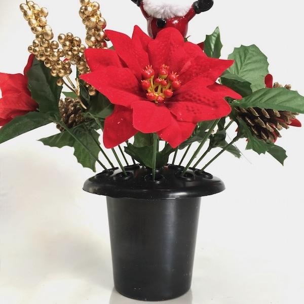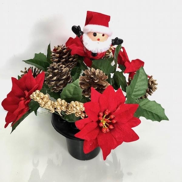 Red Velvet Poinsettia Grave Pot with santa decoration, Arranged in a standard size black plastic grave insert with black lid. Ideal for your loved one's graveside. This grave pot arrangement will fit most memorials and stones.