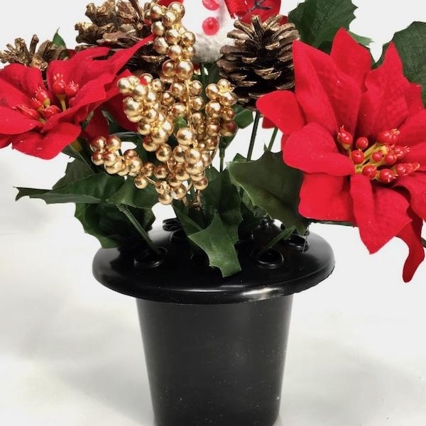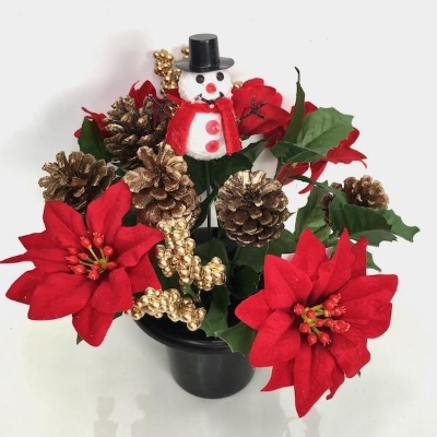 Red Velvet Poinsettia Grave Pot with snowman decoration, Arranged in a standard size black plastic grave insert with black lid. Ideal for your loved one's graveside. This grave pot arrangement will fit most memorials and stones.