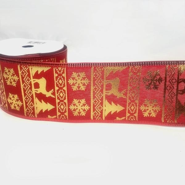 63mm wire edged Christmas ribbon with a red background and gold reindeer design. The ribbon is wire edged for a better finish and is perfect for Christmas gifts, hampers and craft work. This product comes supplied on a 10 yard roll.