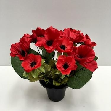 Artificial grave pot arrangement with red poppies and green leaf foliage, ideal for your loved one's graveside. Each arrangement has 14 stems of assorted sized red poppies arranged in standard size black plastic grave insert with black lid. This grave pot arrangement will fit most memorials and stones.
