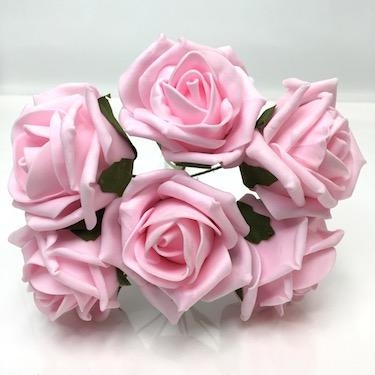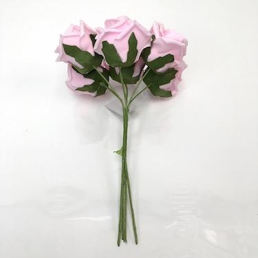 Baby pink open foam roses packed with six stems in a bunch. Each rose has a paper covered wire stem with the head size being approximately 6cm across. Perfect for buttonholes, corsages, wedding bouquets and many other floristry uses.
