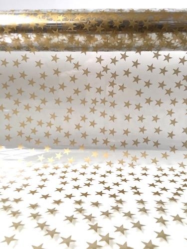 Gold star cellophane wrap, this clear film with a gold star design is perfect for fresh flowers, sweet bouquets, hampers and gift wrapping. Comes on a 100m roll.