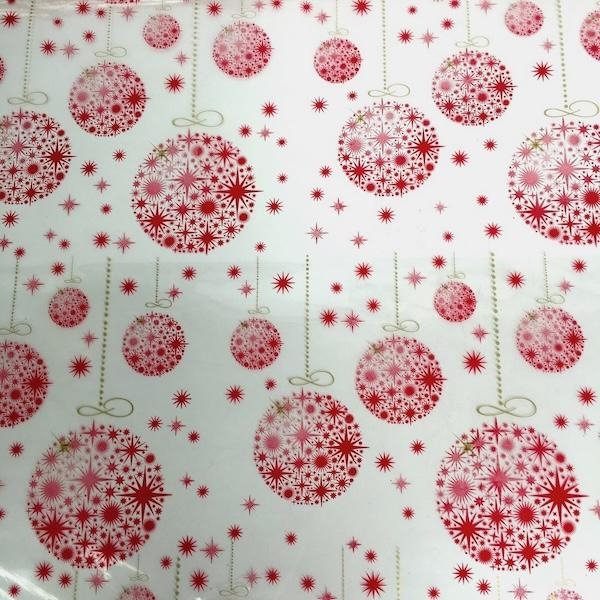 Red Christmas bauble cellophane wrap. 100m length roll x 80cm wide. This clear film with a UK printed red bauble design in a wholesale amount is perfect for Christmas hampers and gift wrapping.