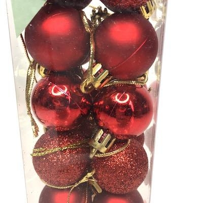 1 pack of 24 red Christmas baubles with gold string and loop attached. These baubles are a great Christmas decoration. The box of baubles has 3 different colour variations, these being frosted, shiny and glittery red.