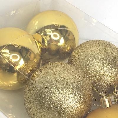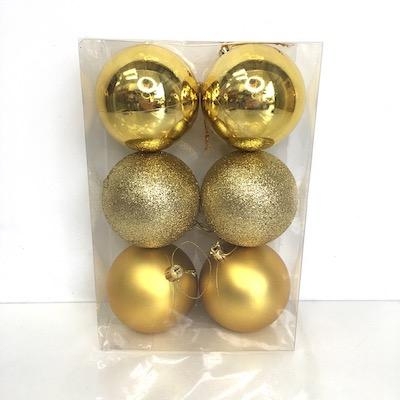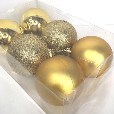 1 pack of 6 gold Christmas baubles with loop attached. These baubles are a great Christmas decoration. The box of baubles has 3 different colour variations, these being frosted, shiny and glittery.